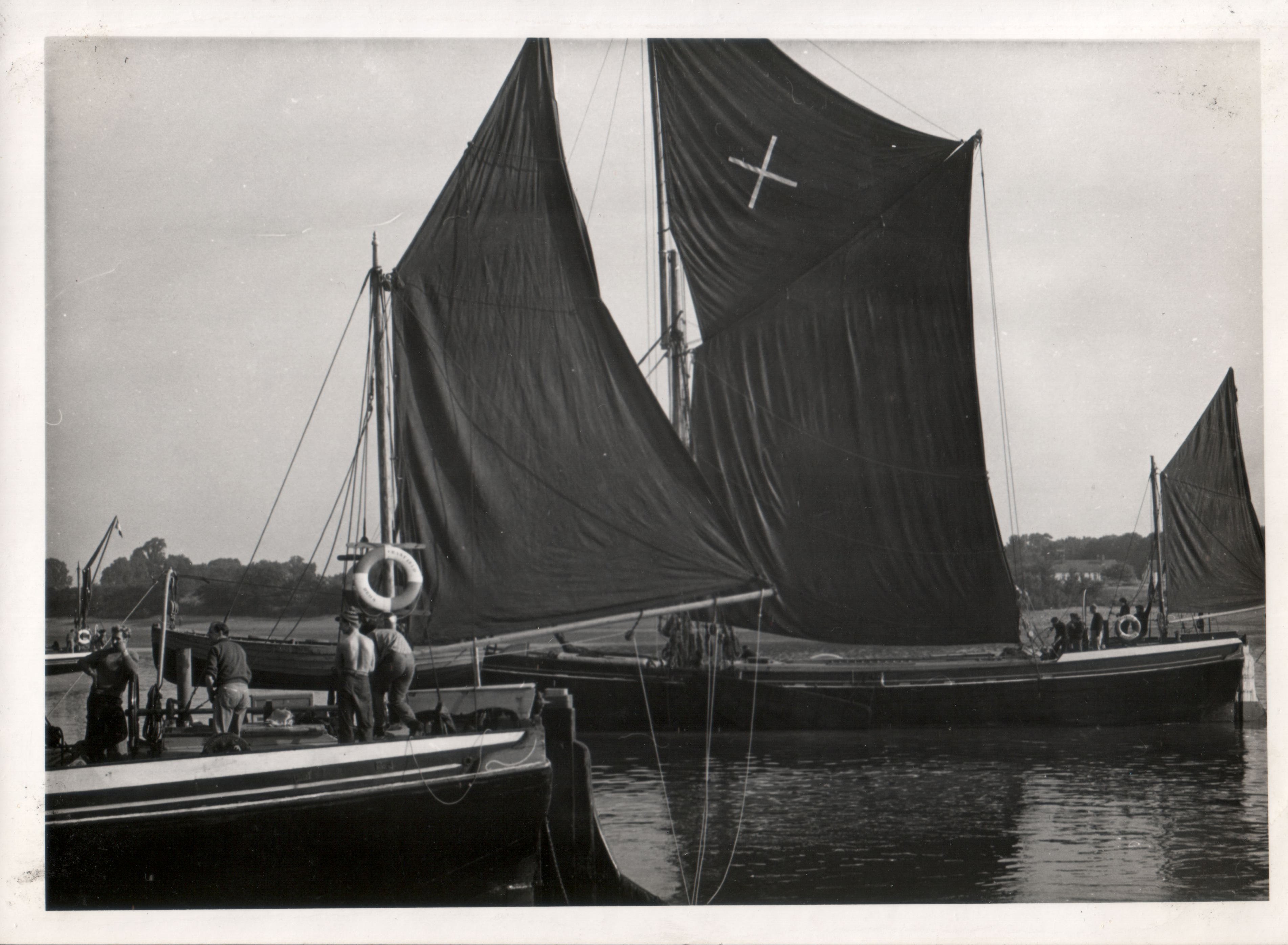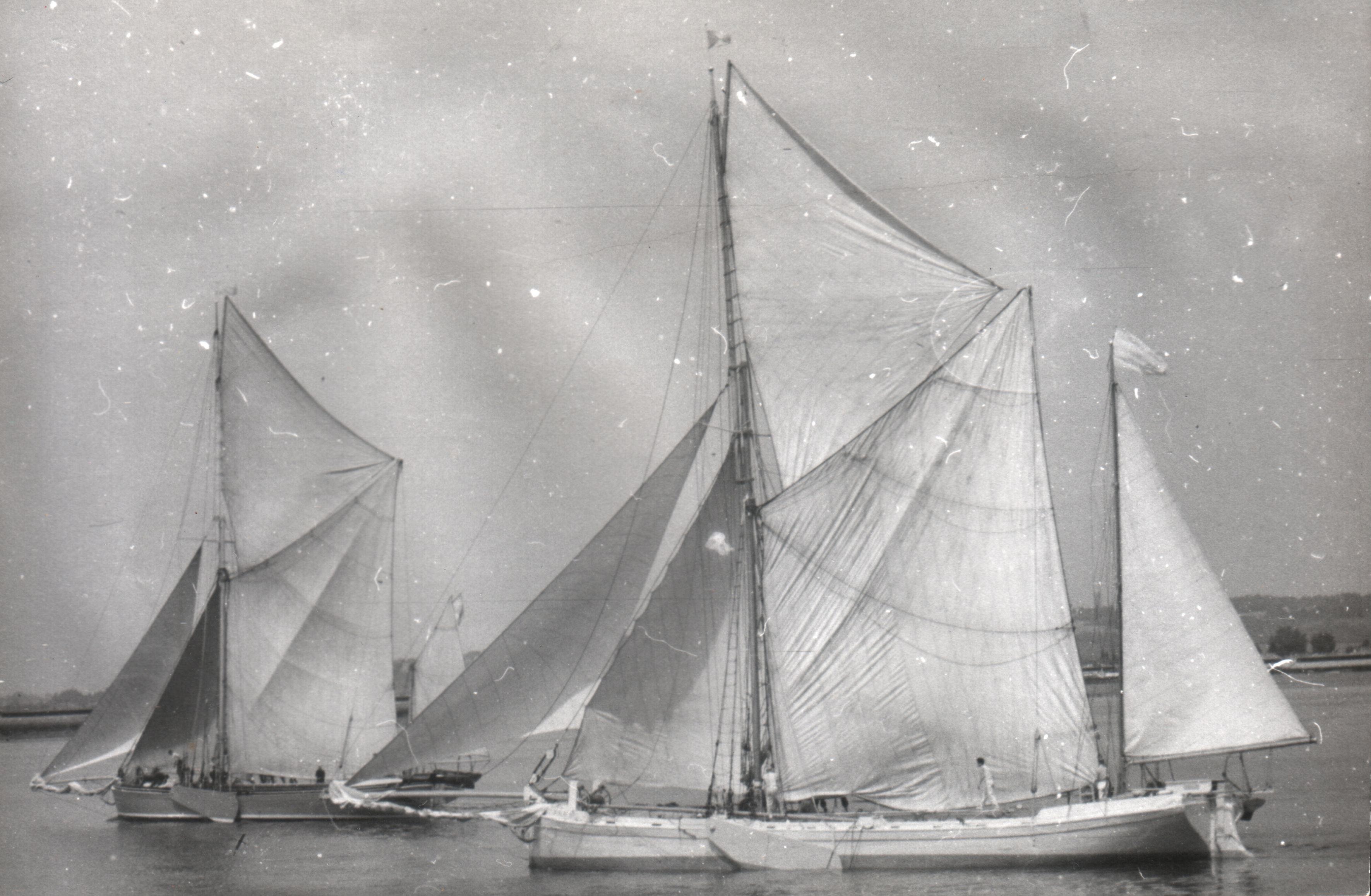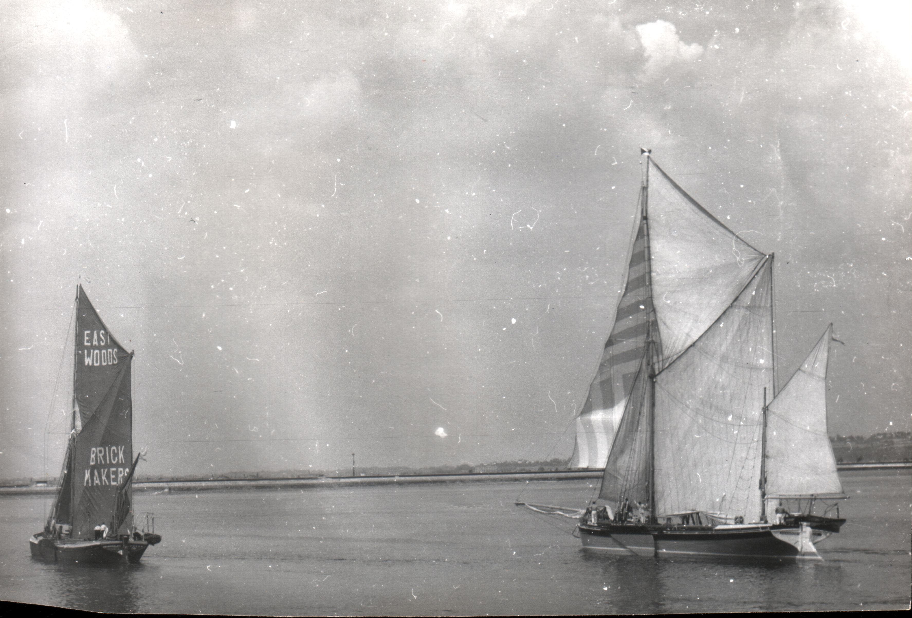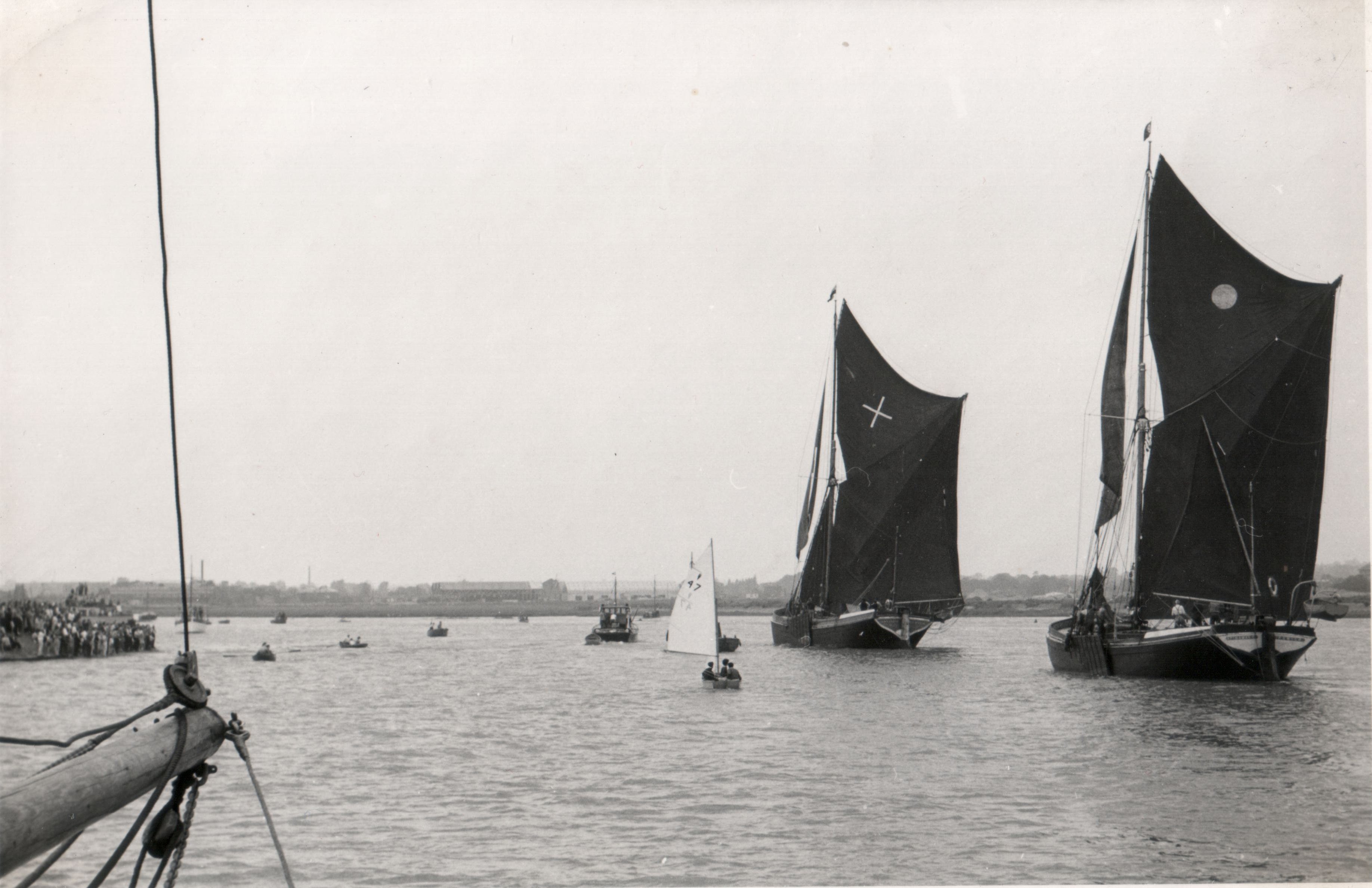 End of the race. SB Marjorie (L) and SB Spinaway C, Blackwater barge match, 1962