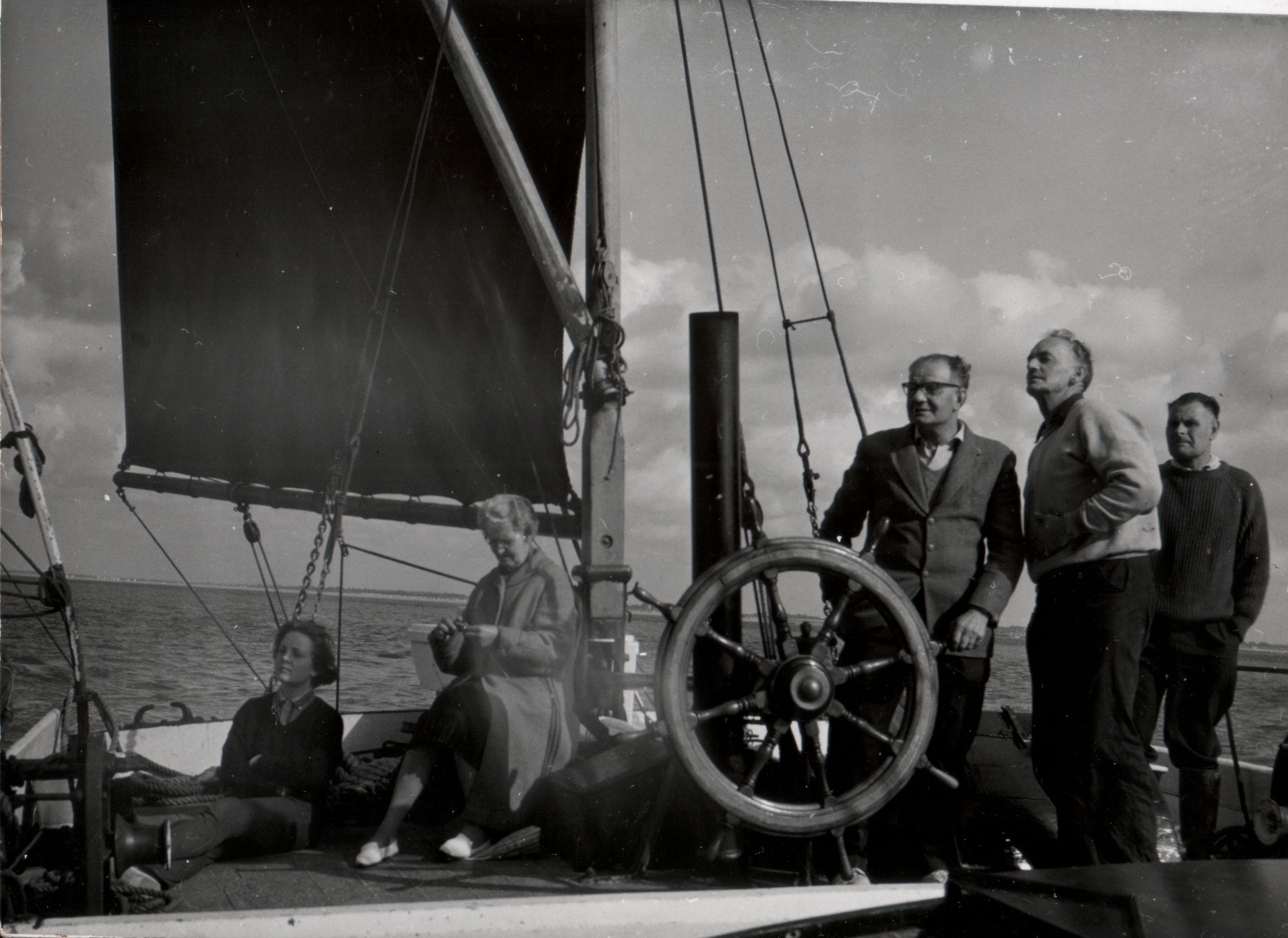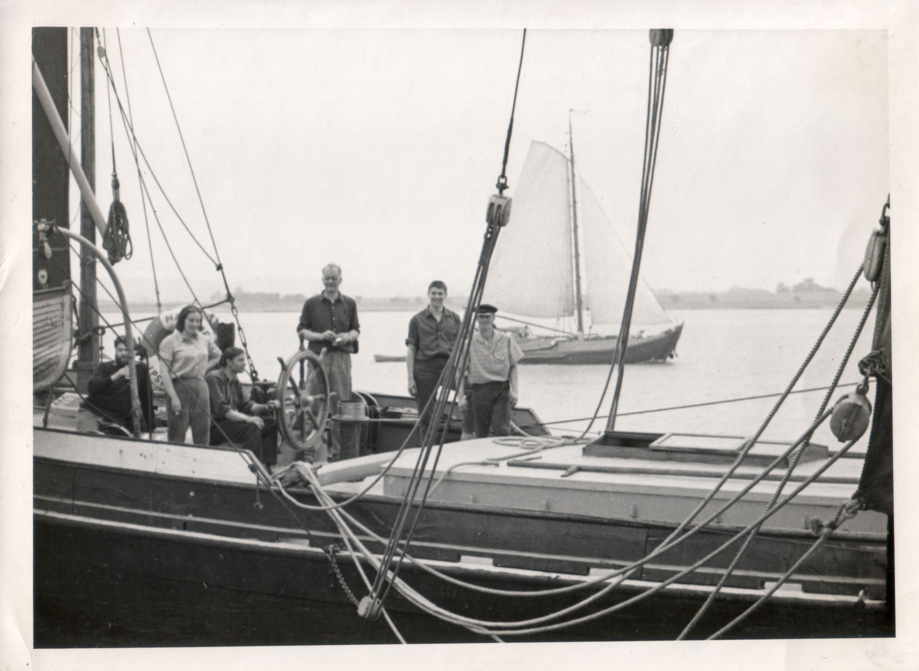 SB Memory, Blackwater barge match, 1963. L to R: Mrs Farrington, Hedley Farrington, Jane Benham, ?Brian Keeble, Hervey Benham