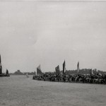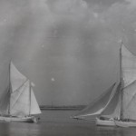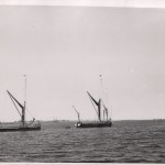 SB Marjorie and SB Spinaway C, first two over the finish line, Blackwater barge match, 1962