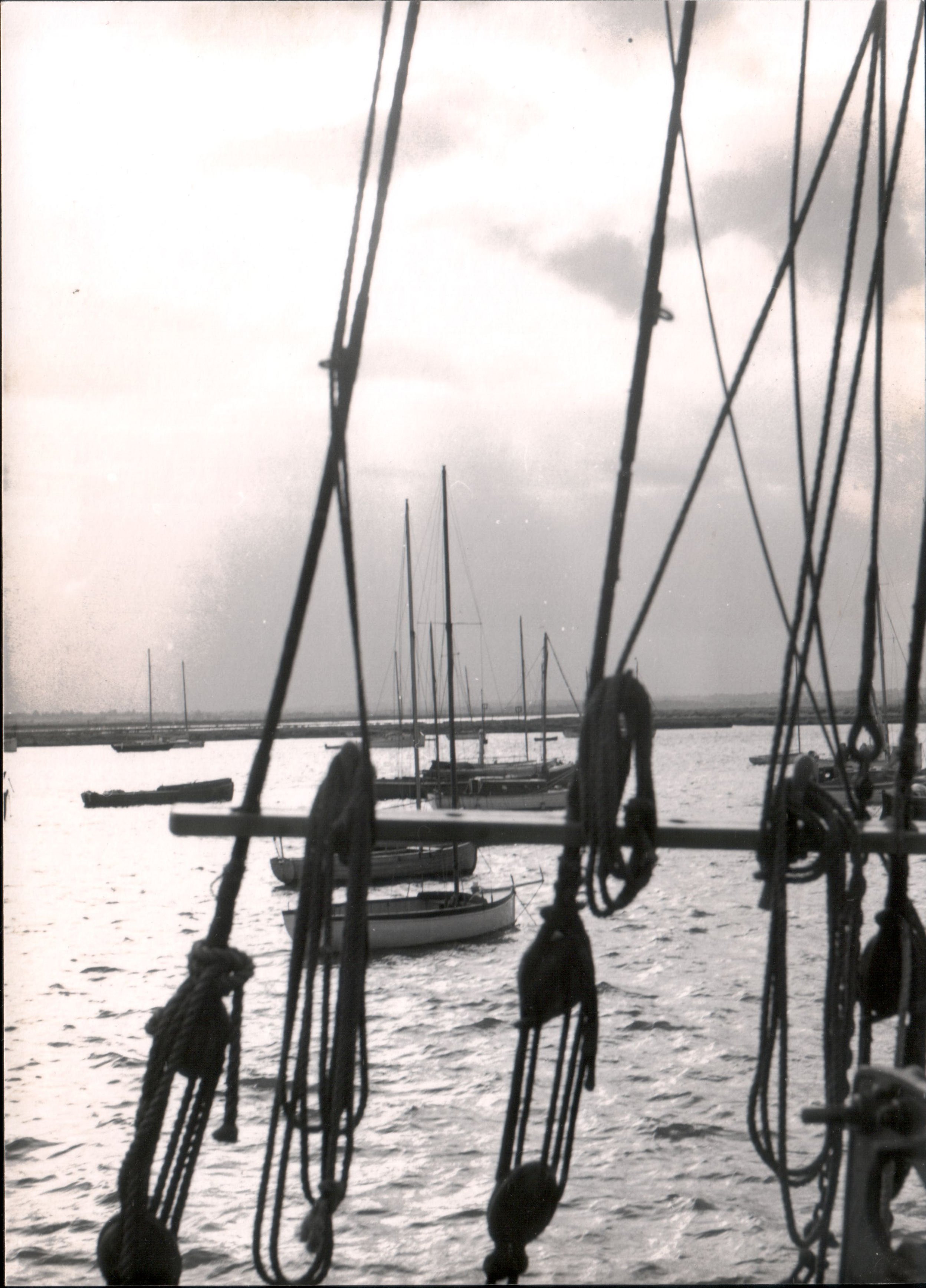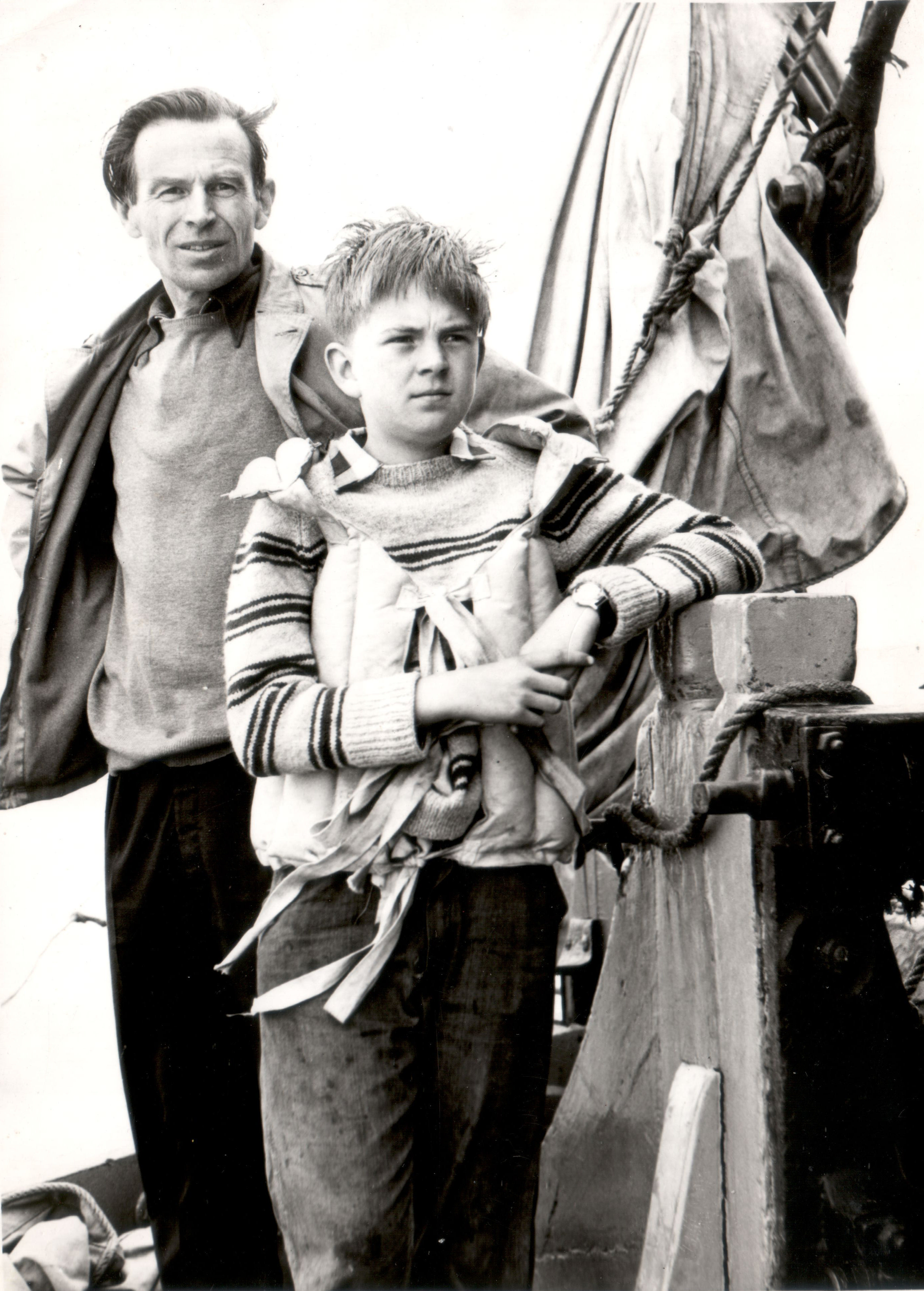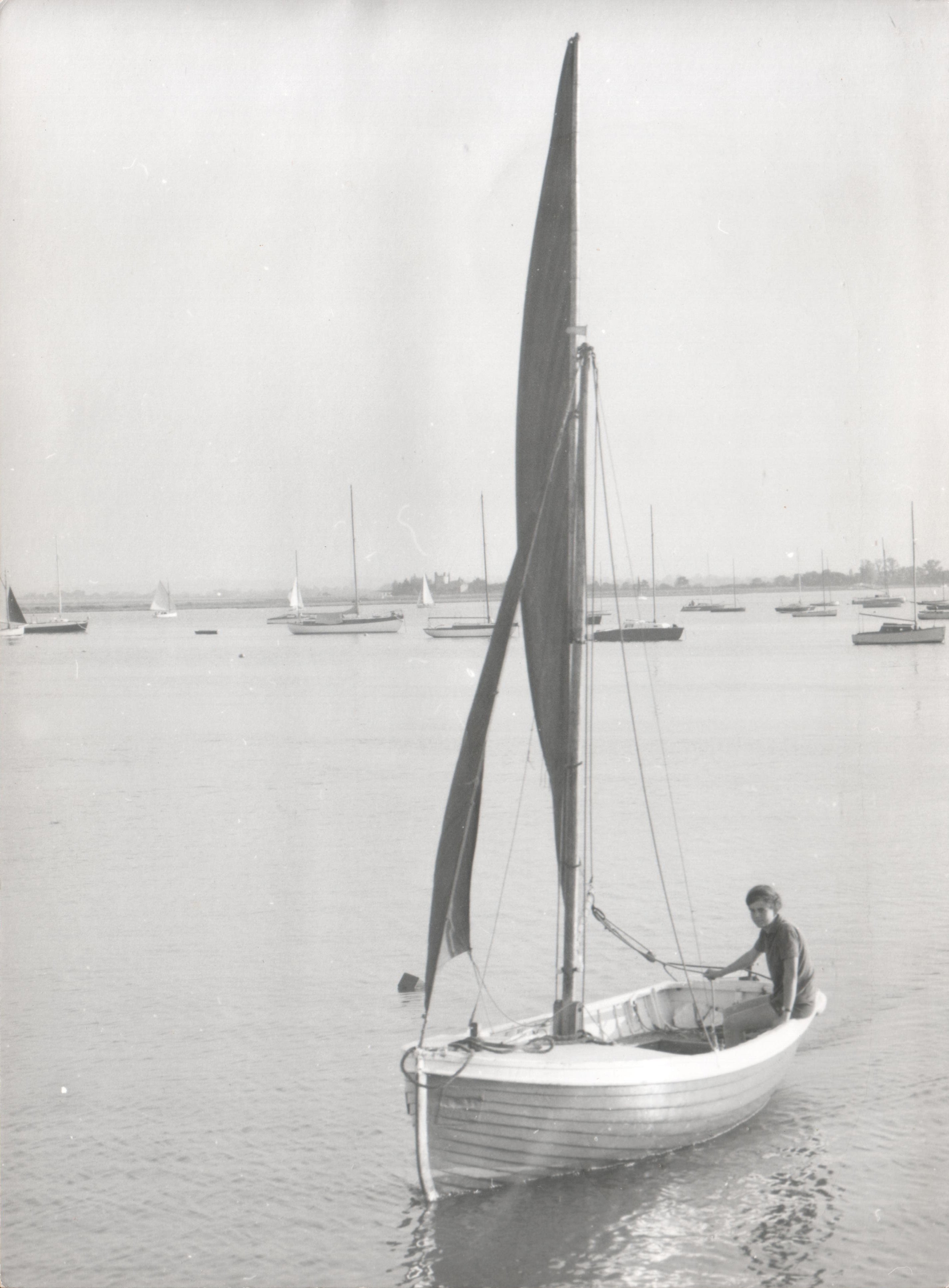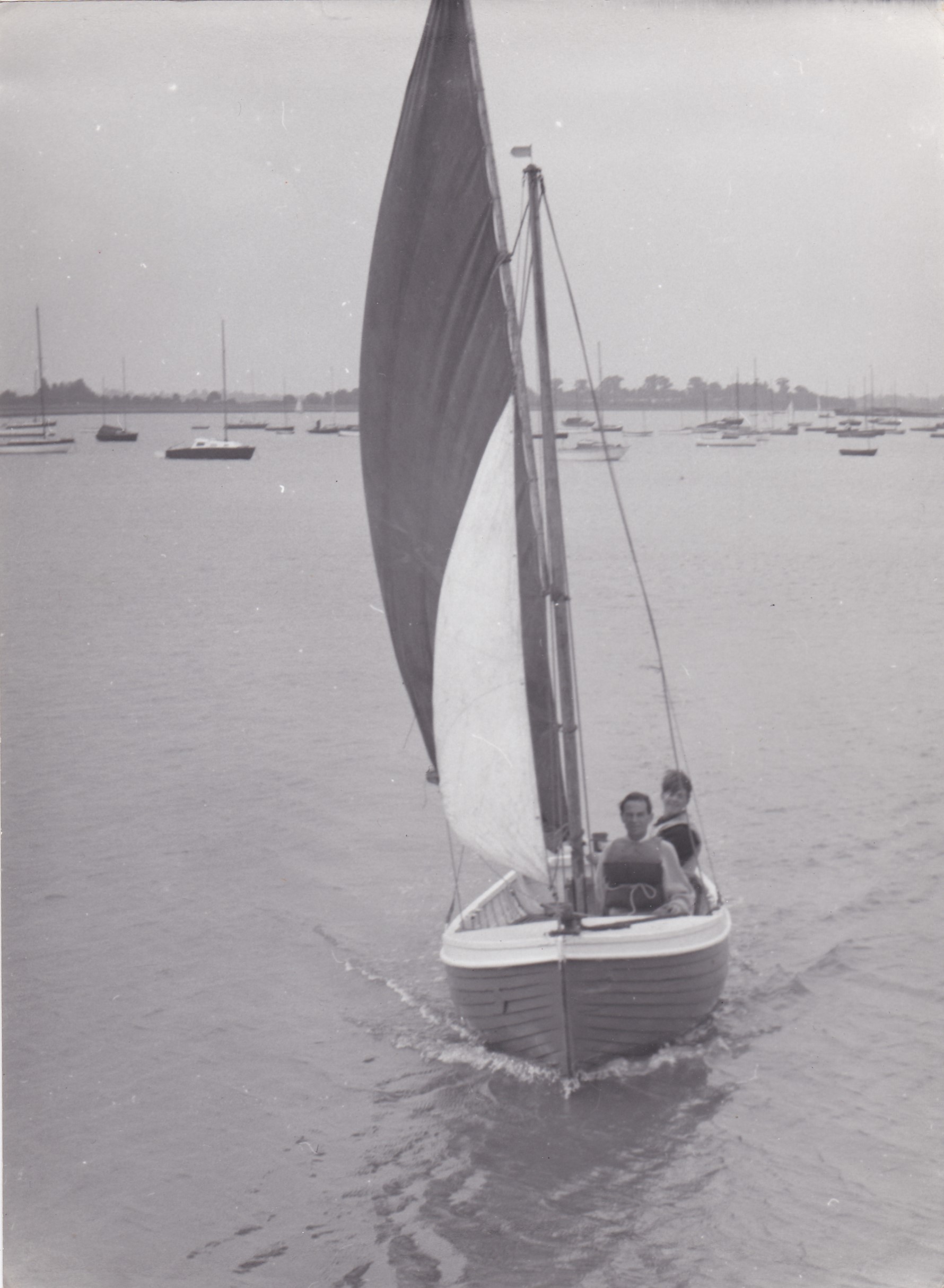 Bob Kemp sailing ‘Puffin’, bought by J E Kemp from Kemp and Beer for £60 in about 1962. She was, according to carving in the stem, built at Devonport in 1933 and described in the Manual of Seamanship as a ’16-foot dinghy, lug sloop rig, “MW”‘. Her whereabouts now is unknown.