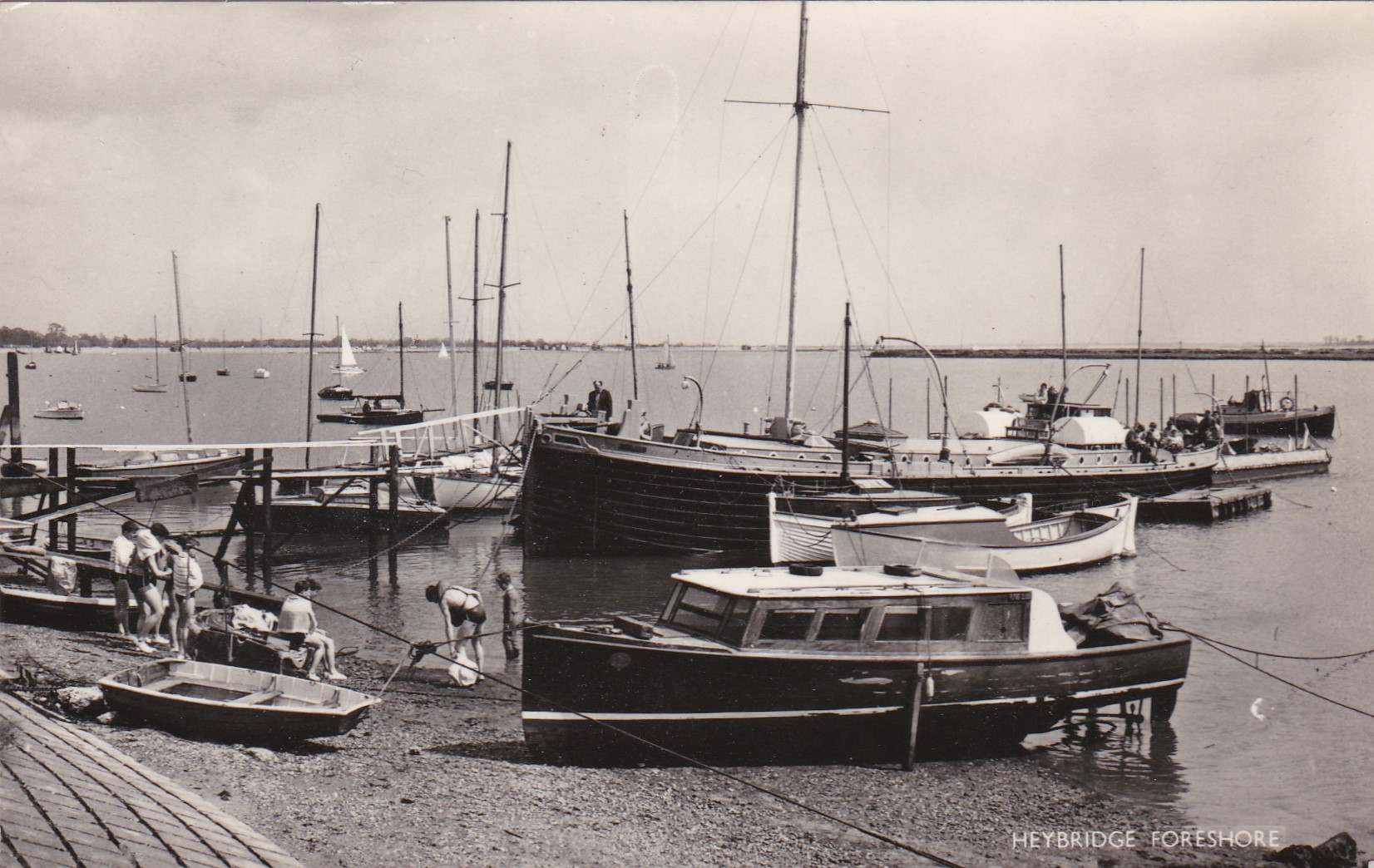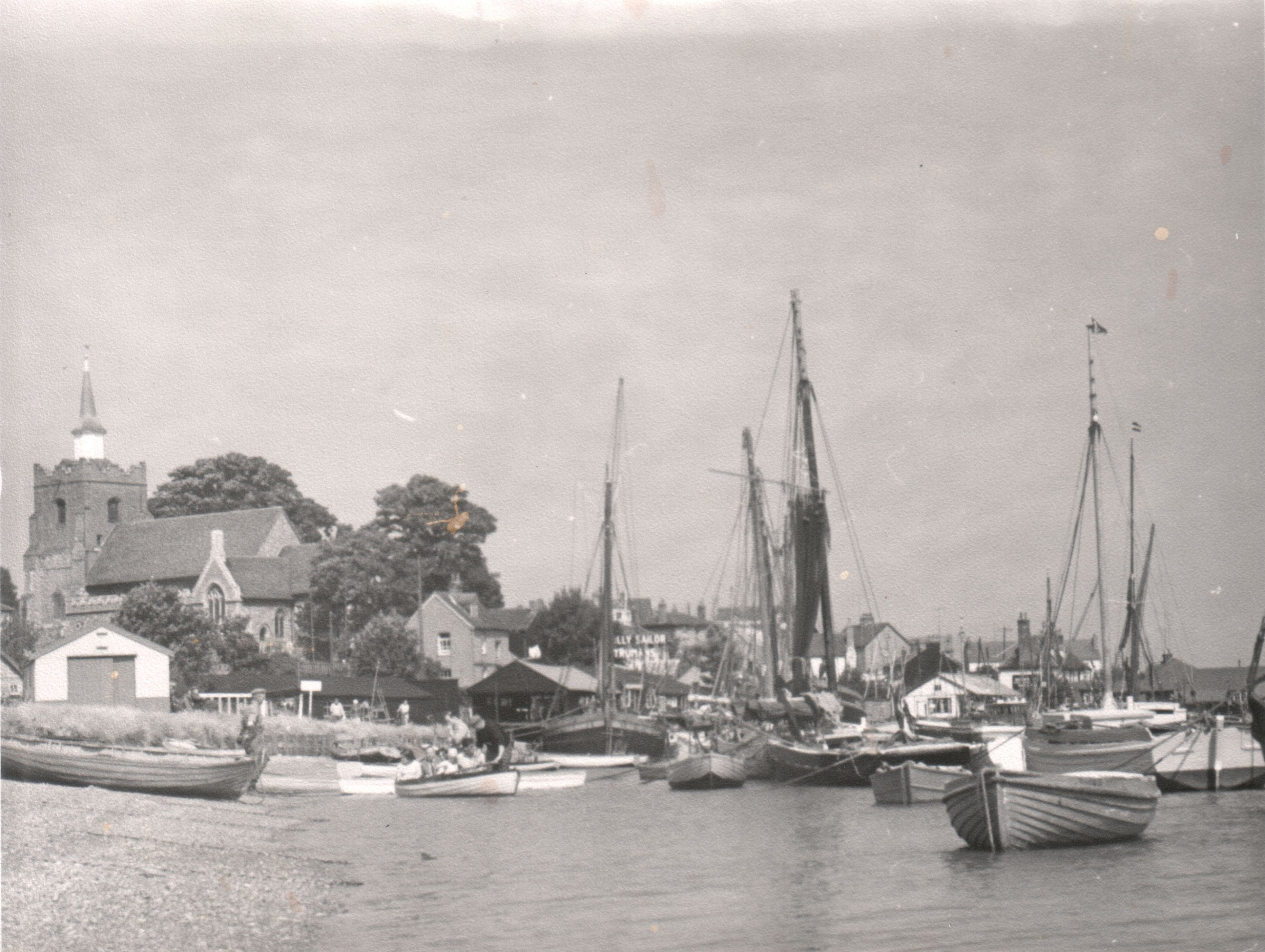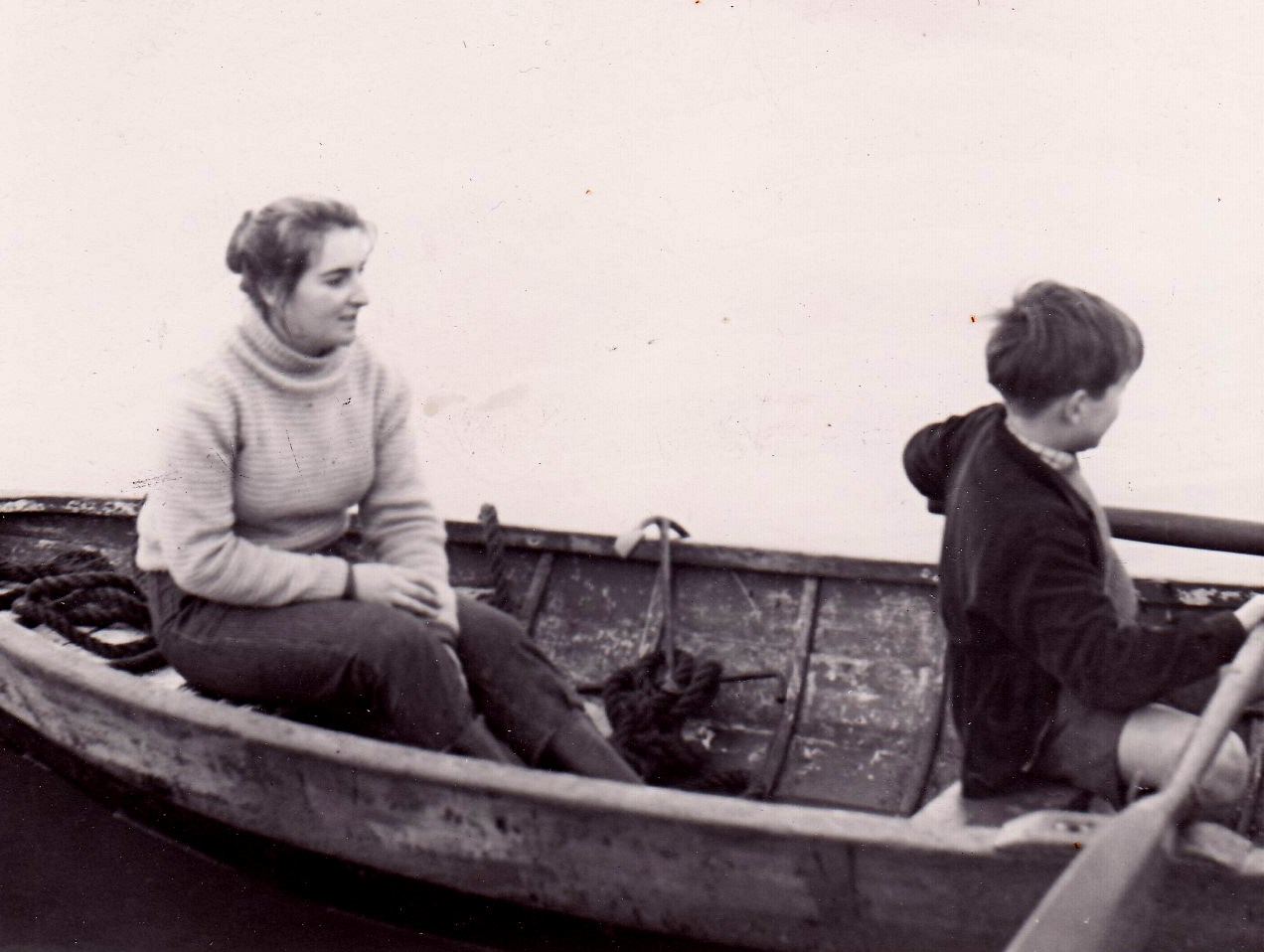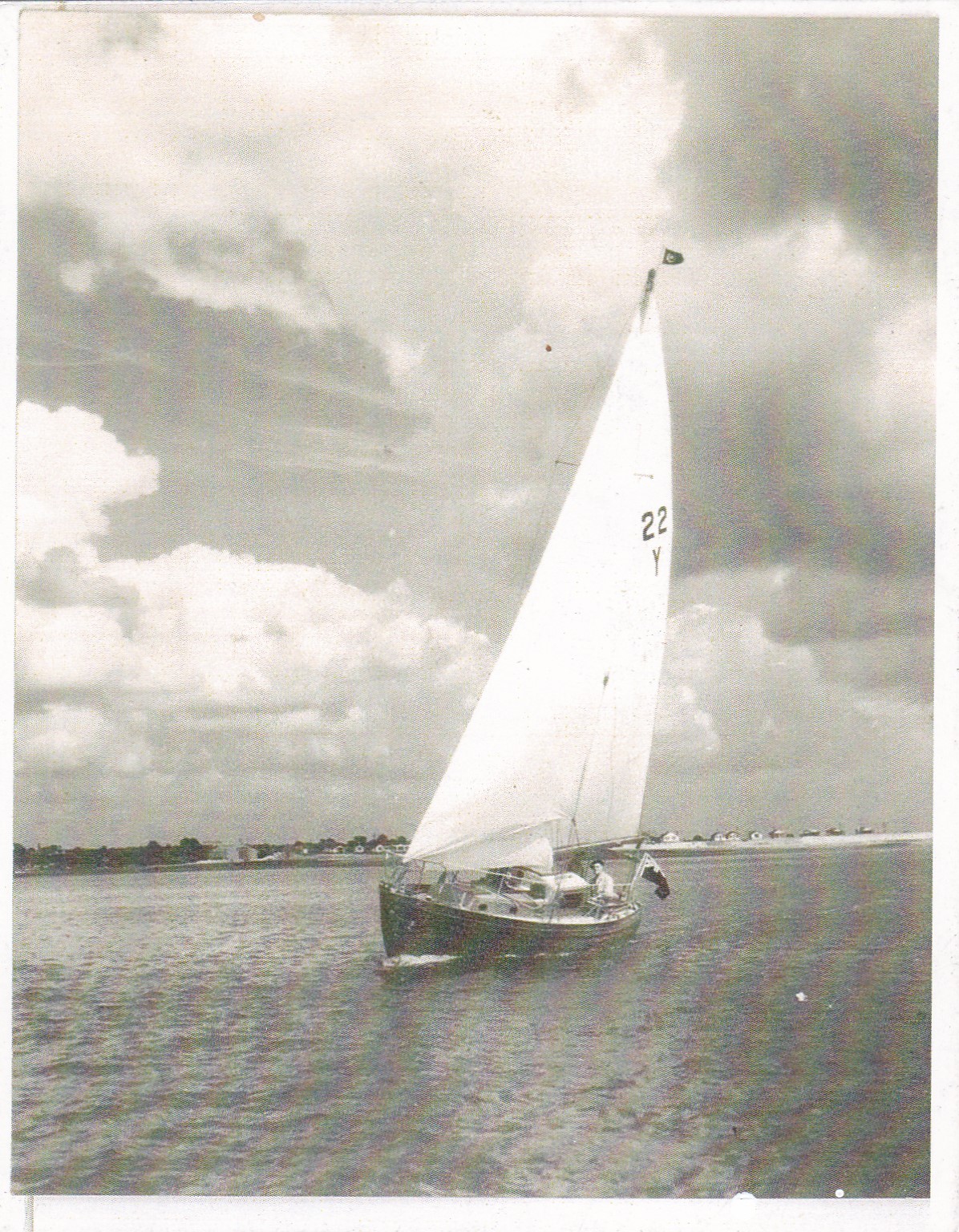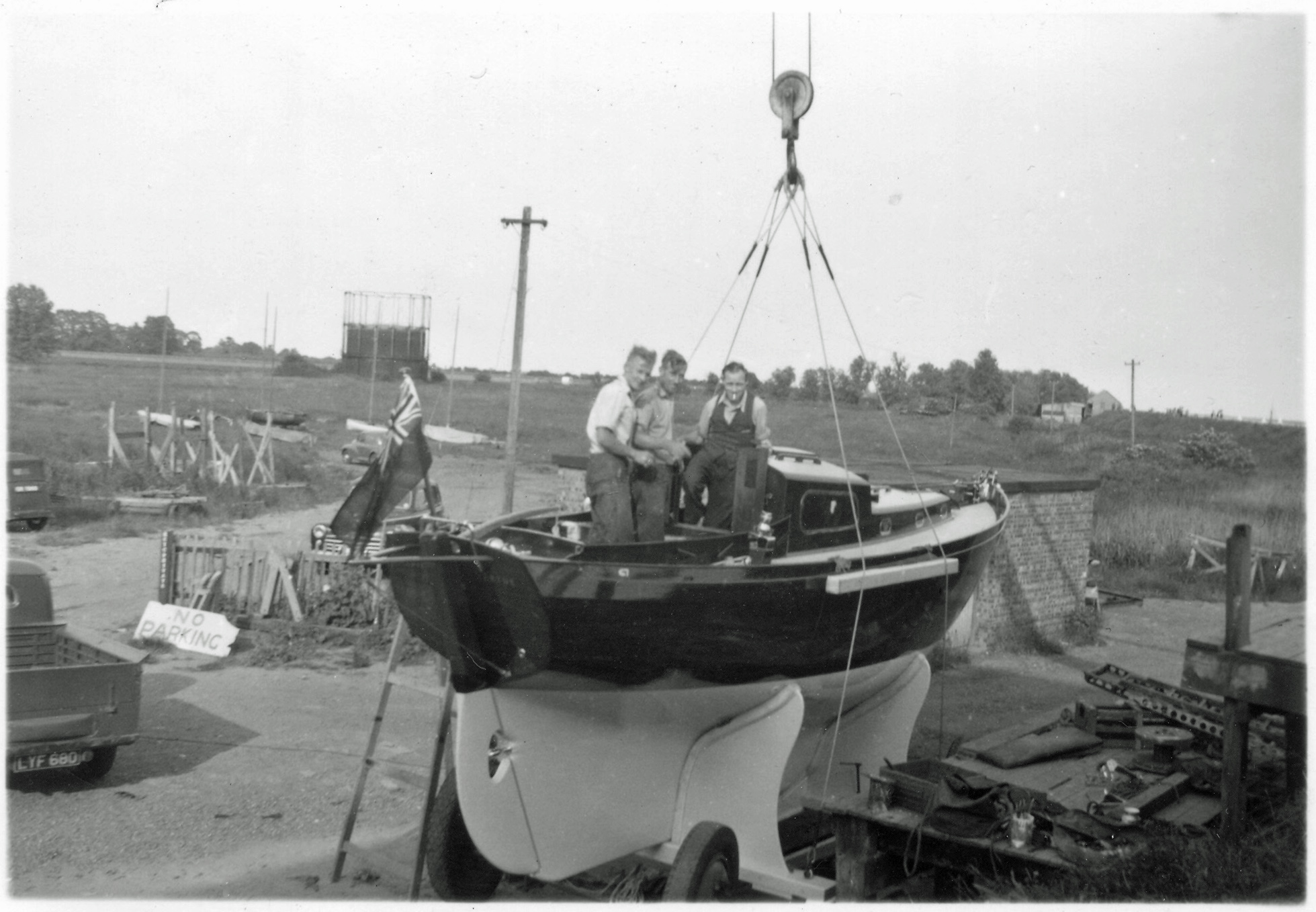 Bob Kemp sailing ‘Puffin’, bought by J E Kemp from Kemp and Beer for £60 in about 1962. She was, according to carving in the stem, built at Devonport in 1933 and described in the Manual of Seamanship as a ’16-foot dinghy, lug sloop rig, “MW”‘. Her whereabouts now is unknown.