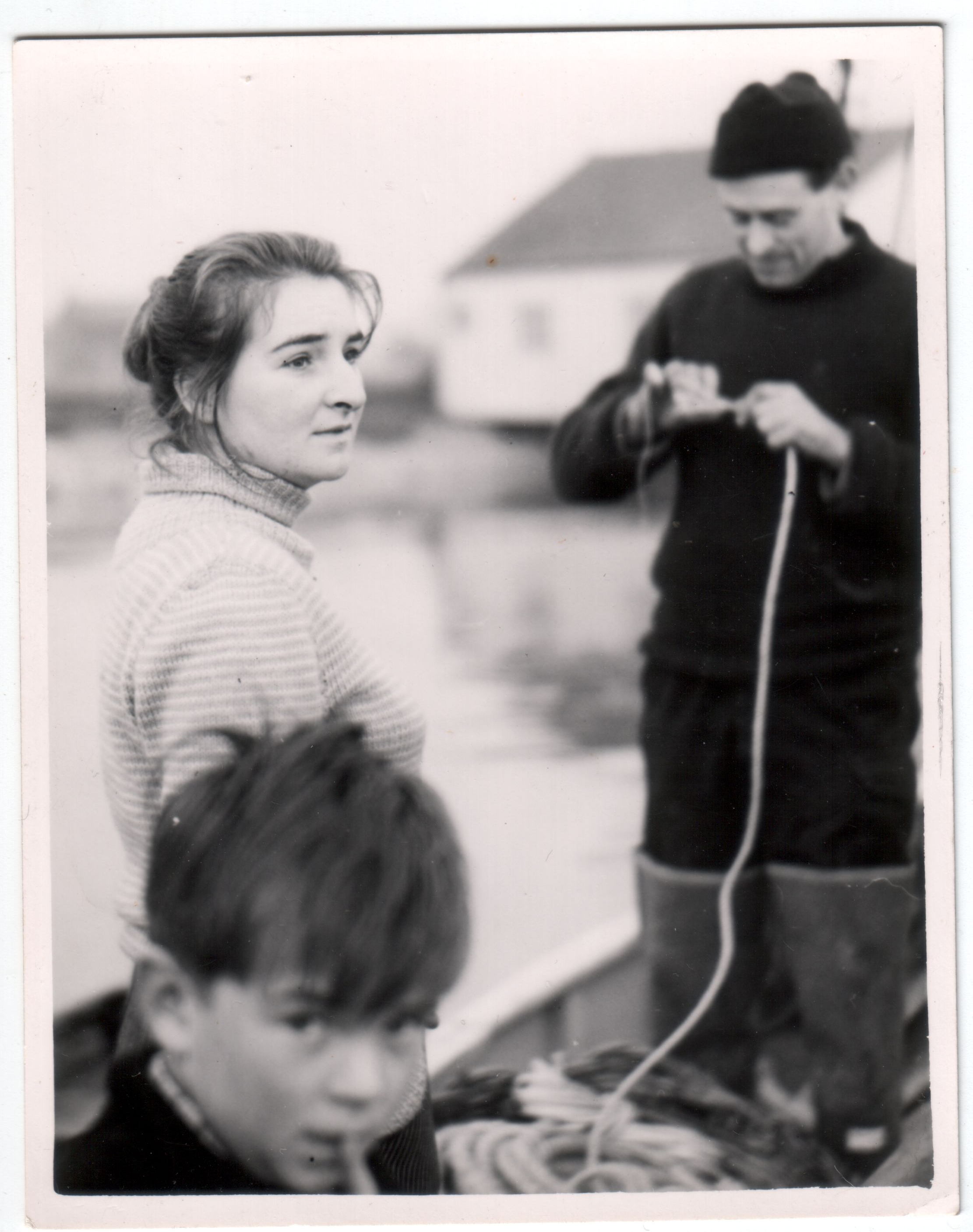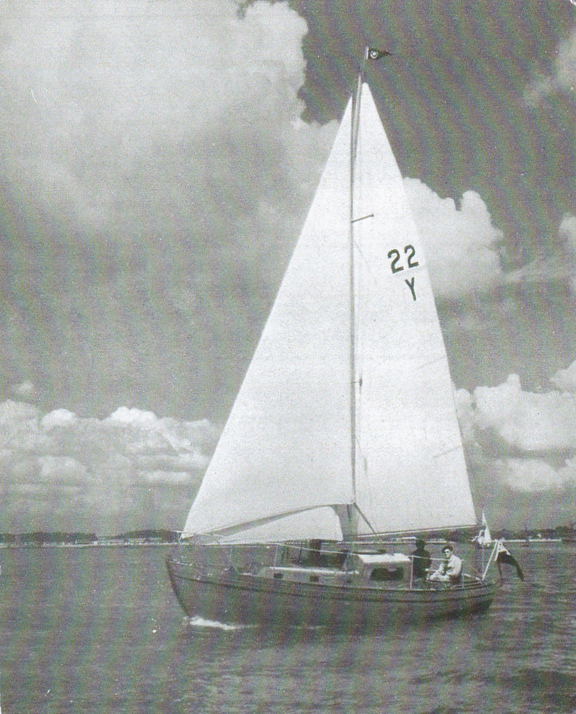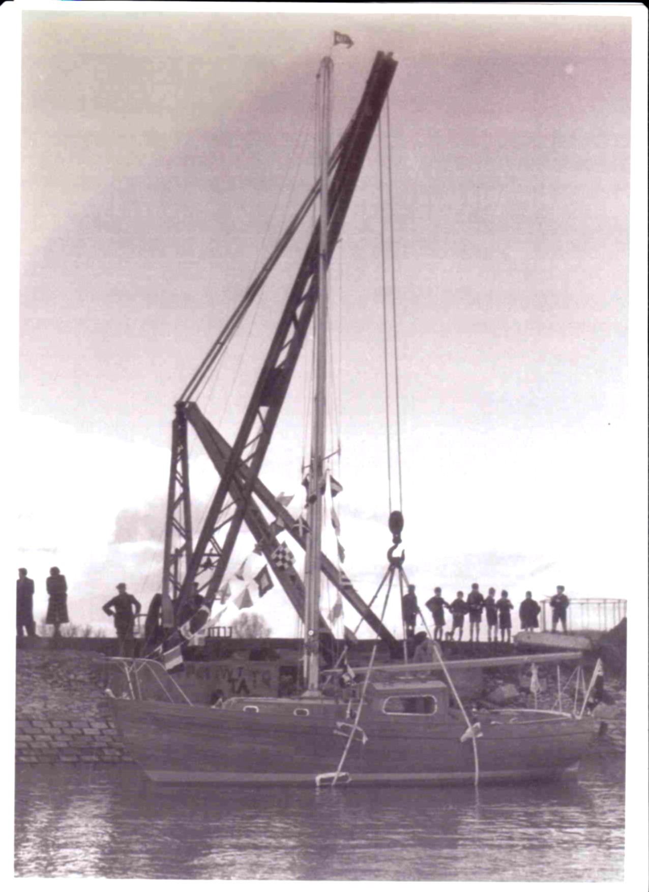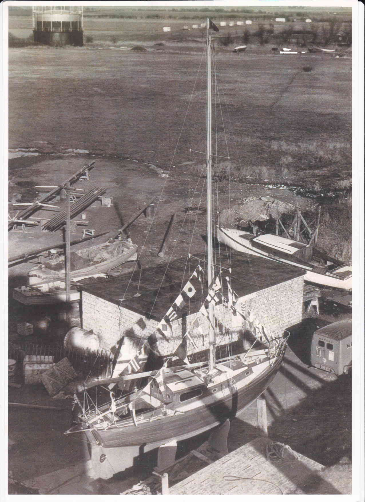 Bob Kemp sailing ‘Puffin’, bought by J E Kemp from Kemp and Beer for £60 in about 1962. She was, according to carving in the stem, built at Devonport in 1933 and described in the Manual of Seamanship as a ’16-foot dinghy, lug sloop rig, “MW”‘. Her whereabouts now is unknown.