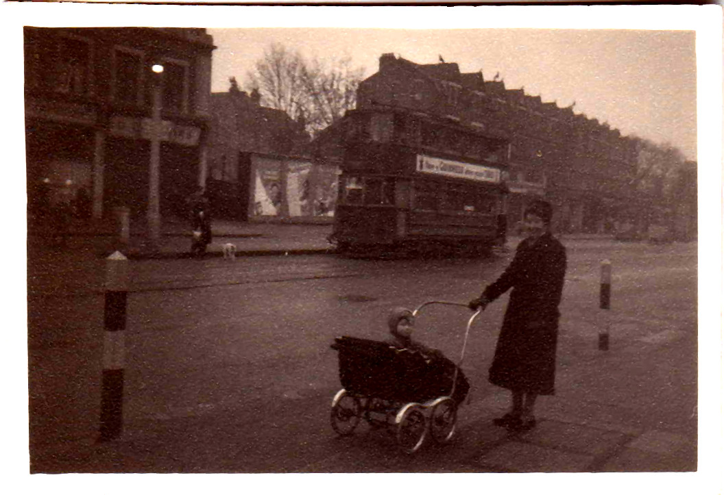 Bob (in pram) and Pat Kemp, Balham High Street, 6 January 1951.